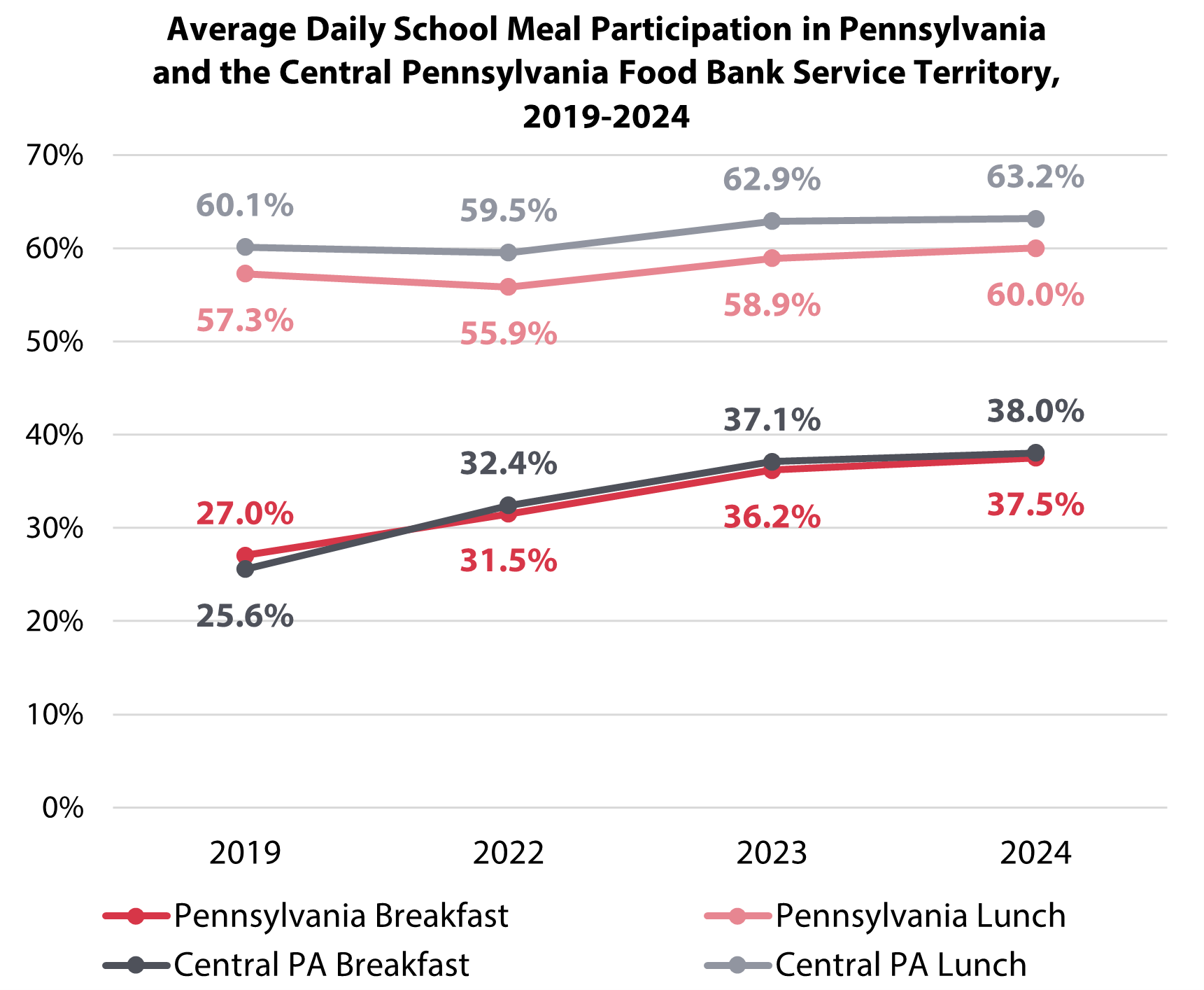 In public schools in Central Pennsylvania Food Bank’s service territory, participation grew even more over the same time frame, leaping almost 50%, from 25.6% in 2019 to 38.0% in 2024. Central Pennsylvania public schools now slightly outpace their peers across the Commonwealth in breakfast participation.